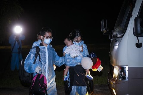| Des Vietnamiens de retour du Japon mis en quarantaine à Hoà Binh (Nord), le 8 octobre. |