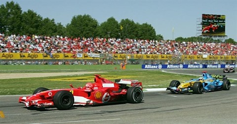 | La Ferrari de Michael Schumacher devant la Renault de Fernando Alonso, à Imola, en 2006 |