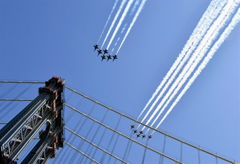 | Des appareils de l'armée de l'air et de la marine survolent New York en hommage aux personnels soignants, le 28 avril. |