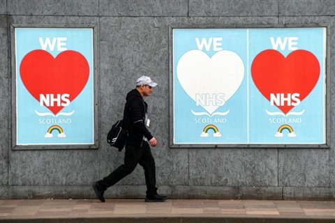 | Affiches remerciant le personnel du service public de santé, le NHS, à Glasgow, en Écosse, le 28 avril. |
