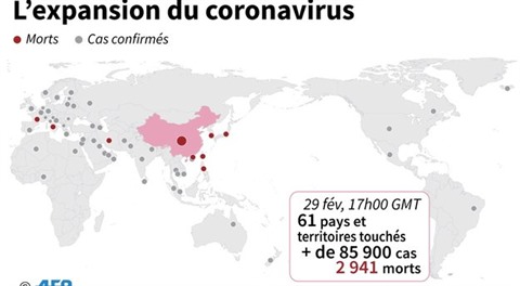 L'épidémie s'approche des 3.000 morts pour plus de 86.000 cas dans une soixantaine de pays - dont près de 80.000 cas pour 2.870 décès en Chine, selon le dernier point fait dimanche.