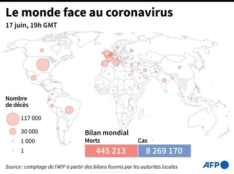 | Nombre de morts liés au coronavirus officiellement annoncés par pays, au 17 juin à 19h GMT. |