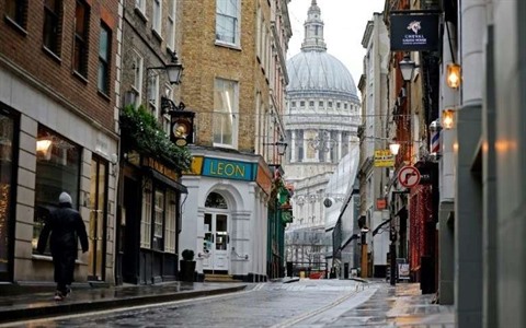 | Une personne marche dans une rue de Londres rendue déserte par le confinement, le 5 janvier. |