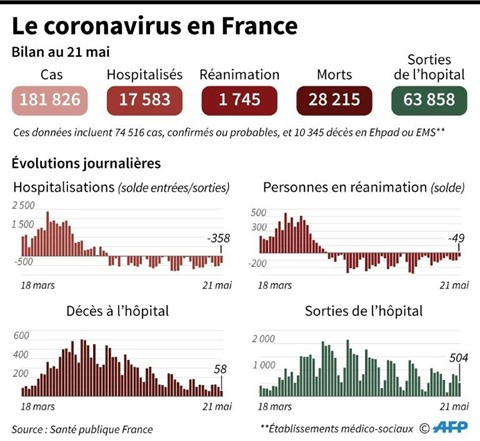 | Augmentations journalières des morts du COVID-19 en France, des personnes en réanimation, des hospitalisations et des sorties d'hôpital, au 21 mai. |