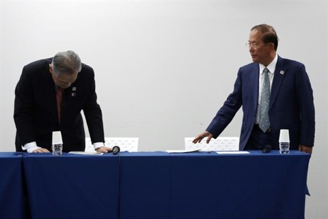 | Le président de Tokyo 2020, Yoshiro Mori, et le directeur exécutif du comité d'organisation de Tokyo 2020, Toshiro Muto, lors de la conférence de presse le 24 mars dans la capitale japonaise |