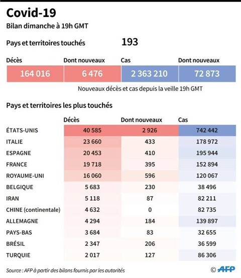 La pandémie a fait plus de 164.000 morts dans le monde, dont près des deux tiers en Europe, depuis son apparition en Chine en décembre 2019 dans la ville de Wuhan (Centre), selon un bilan établi par l'AFP à partir de sources officielles dimanche à la mi-journée.