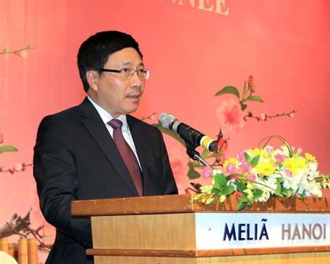 | Le vice-Premier ministre et ministre des Affaires étrangères Pham Binh Minh prend la parole lors d'une rencontre du corps diplomatique à l'approche du Têt de Chèvre 2015, organisée mercredi soir 4 février à Hanoi. |