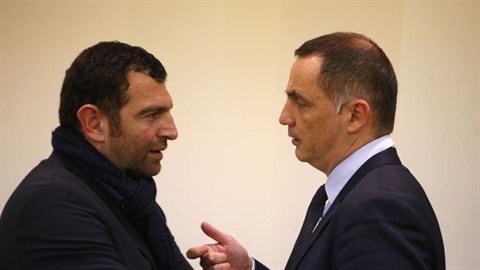| Le président autonomiste du conseil exécutif Gilles Simeoni (droite) s'entretient avec le maire de Bonifacio Charles Orsucci le 2 février 2018 à Ajaccio, en Corse. |