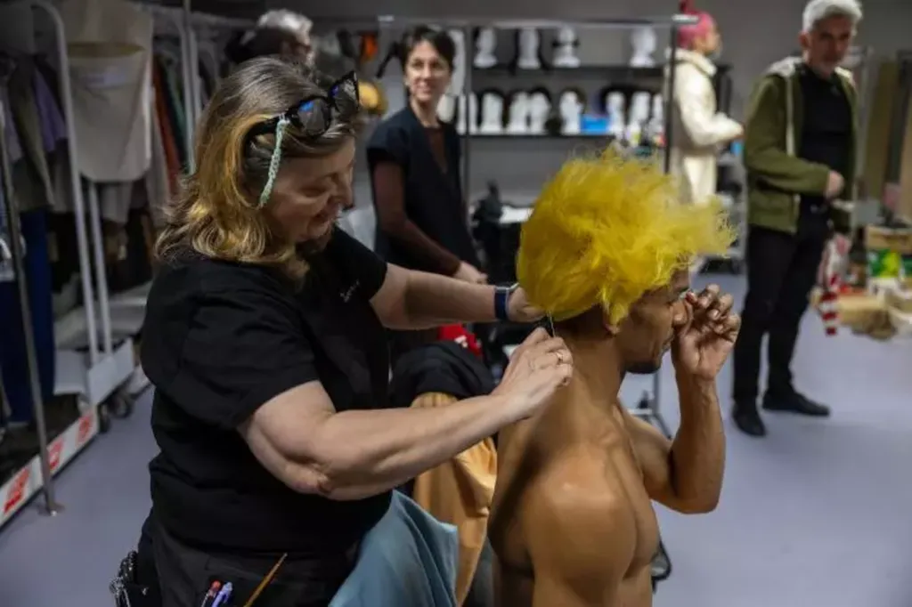 | Un acteur se fait poser une perruque dans le cadre de la préparation d'un nouveau spectacle de "La Fiancée vendue", un opéra comique en trois actes du compositeur tchèque Bedřich Smetana, le 28 mars. |