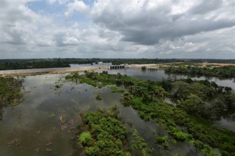 | Vue aérienne du barrage hydroélectrique de Soubré, dans le Sud-Ouest de la Côte d'Ivoire, le 6 mars. |