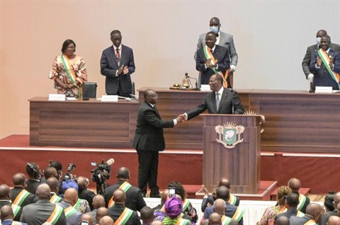 | Le nouveau vice-président ivoirien, Tiemoko Meyliet Koné, vient serrer la main du président Alassane Ouatarra devant les parlementaires, à Abidjan le 19 avril. |