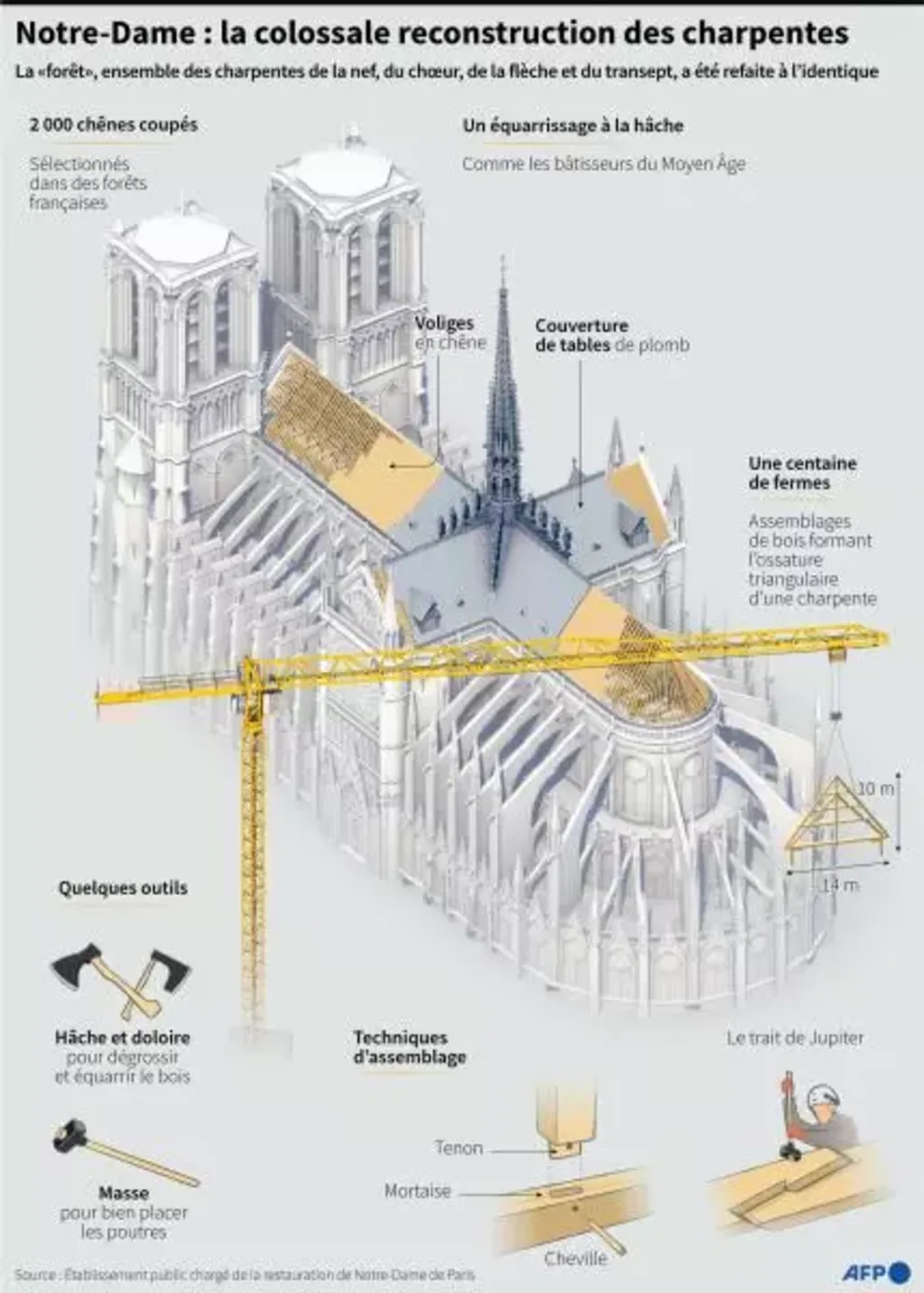 | Infographie montrant le travail de reconstruction des charpentes de Notre-Dame de Paris réalisé après l'incendie qui a fortement endommagé la cathédrale en 2019. Photo : AFP/VNA/CVN |