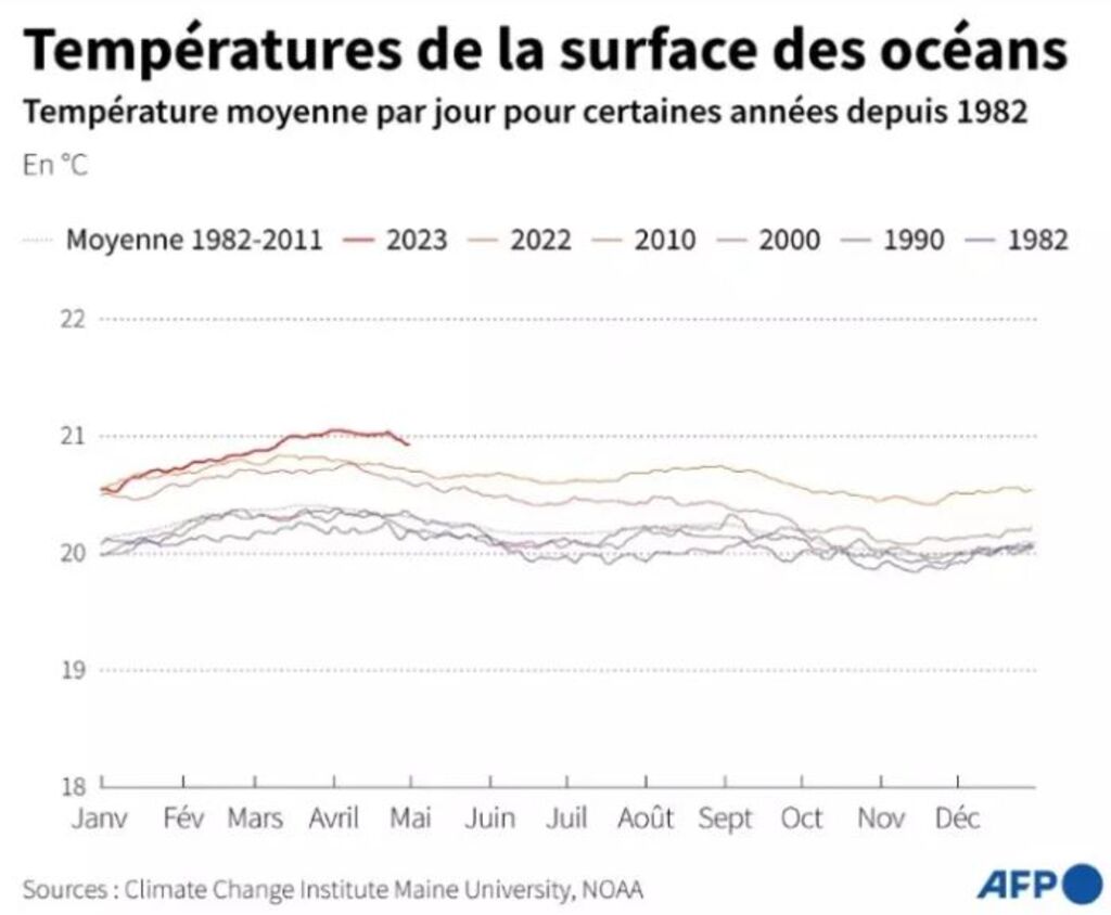 Début avril, la température moyenne à la surface des océans, à l'exception des eaux polaires, a atteint 21,1°C, selon les données de l'observatoire américain NOAA, battant le précédent record de 21°C en mars 2016.