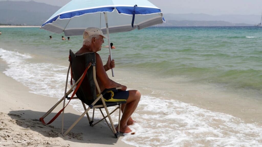 | Un homme sous un parasol à plage à Ajaccio, le 19 juillet 2023. |