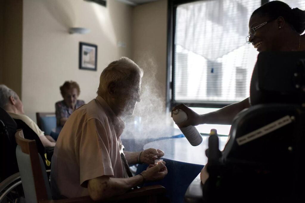 | Une infirmière vaporise de l'eau sur un résident dans une maison de retraite à Lyon, le 2 juillet 2015. |