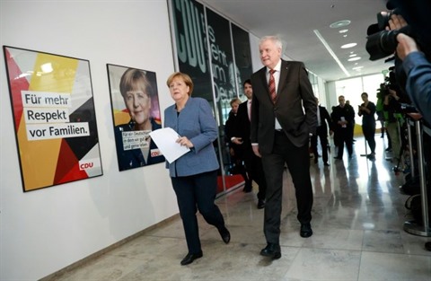 La chancelière Angela Merkel et le patron de CSU, Horst Seehofer, peu avant leur conférence de presse commune tenue le 9 octobre à Berlin. Photo : AFP/VNA/CVN |