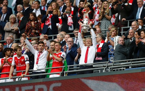 | Les joueurs d'Arsenal et leur entraîneur Arsène Wenger lors de la remise de la Cup, remportée face à Chelsea, le 27 mai à Wembley |