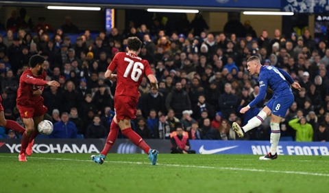 | Le milieu anglais de Chelsea, Ross Barkley (droite), fait le break d'une frappe puissante devant les défenseurs passifs de Liverpool, le 3 mars à Stamford Bridge. |