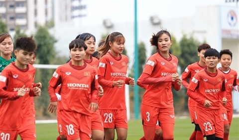 | L’équipe de football féminin du Vietnam lors d'un entraînement à Hanoï. |