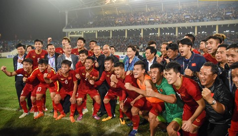 | Des dirigeants du pays et du secteur national des sports partagent la joie des footballeurs vietnamiens après avoir battu la Thaïlande au stade national de My Dinh, à Hanoï. |