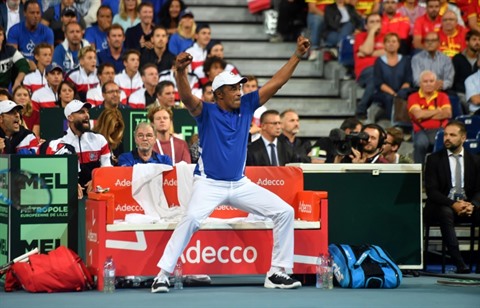 | Les Français Jo-Wilfried Tsonga (gauche) et Lucas Pouille, vainqueurs de la Coupe Davis devant la Belgique à Villeneuve-d'Ascq, le 26 novembre 2017. |
