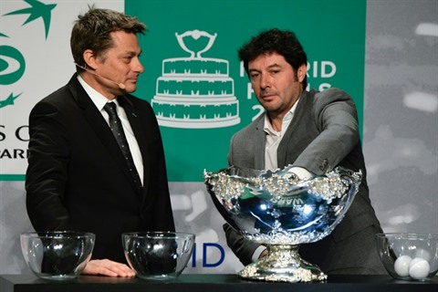 | L'arbitre suisse Andreas Egli (gauche) et le capitaine de l'équipe de France de Coupe Davis Sébastien Grosjean lors du tirage au sort de la Coupe Davis, le 14 février à Madrid. |