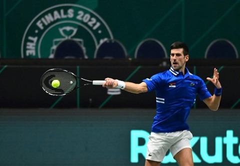 | Le Serbe Novak Djokovic, victorieux de l'Autrichien Dennis Novak, lors de leur lère rencontre de la Coupe Davis, le 26 novembre à Innsbruck. |