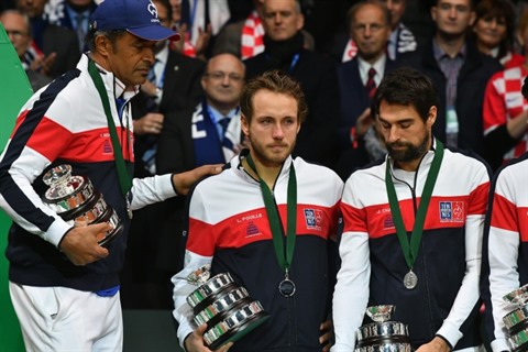 | Le capitaine français Yannick Noah (gauche) aux côtés de ses joueurs Lucas Pouille (centre) et Jérémy Chardy après la défaite contre la Croatie. |