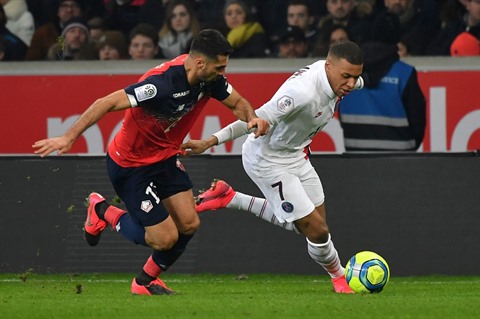 | L'attaquant du Paris Saint-Germain, Kylian Mbappé, tente de déborder le défenseur turc de Lille, Zeki Celik, lors de leur match de L1, le 26 janvier 2020 au stade Pierre-Mauroy à Villeneuve d'Ascq. |