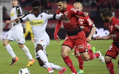 | Le milieu d'Angers, Yohann Eudeline (gauche), à la lutte avec celui de Dijon Mehdi Abeid, le 22 avril à Dijon. |
