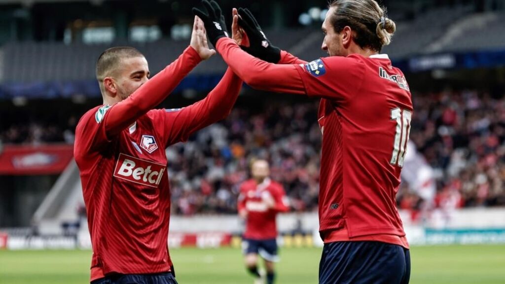 | Edon Zhegrova (gauche) et Yusuf Yazici se congratulent après le premier des 12 buts de Lille contre Golden Lion, en Coupe de France, le 6 janvier. |
