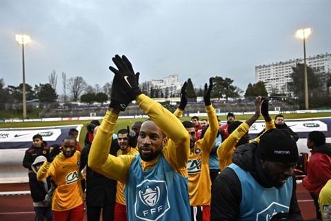 | Les joueurs de Viry-Châtillon lors de la victoire face à Angers en 32es de finale de Coupe de France, le 5 janvier 2019. |