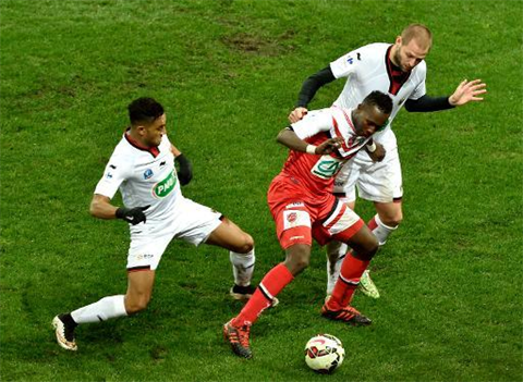 | L'attaquant de Valenciennes, Abdoul Kaboré (centre), à la lutte avec les défenseurs de l'OGC Nice, le 3 janvier au stade du Hainaut. |