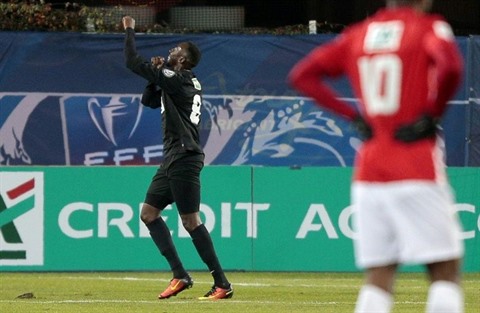 | L'attaquant Oumar Camara ouvre le score pour Bastia face à Nancy en 16e de finale de Coupe de France, le 1er février à Ajaccio. |