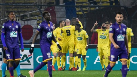 | L'attaquant de Nantes Kalifa Coulibaly (centre) félicité par ses coéquipiers après son but contre Toulouse en 8es de finale de la Coupe de France, le 5 février à Nantes. |