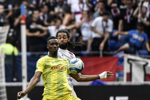 | L'attaquant nantais Kalifa Coulibaly est marqué par le Lyonnais Jason Denayer, lors de leur confrontation en L1 au Parc OL, le 28 septembre 2019. |