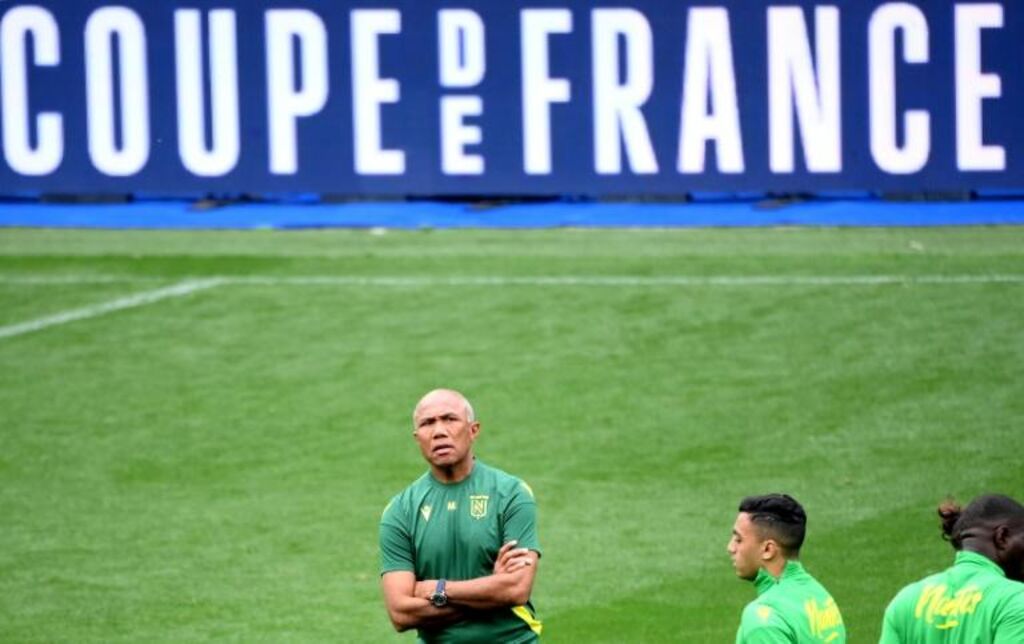 | L'entraîneur du FC Nantes, Antoine Kombouaré (centre), au Stade de France, le 28 avril à Saint-Denis, la veille de la finale de la Coupe de France contre Toulouse. |