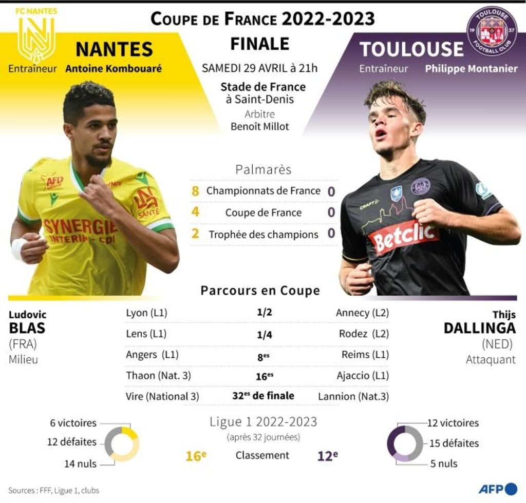 | Nantes et Toulouse s'affrontent ce samedi soir 29 avril au Stade de France en finale de la Coupe de France. |