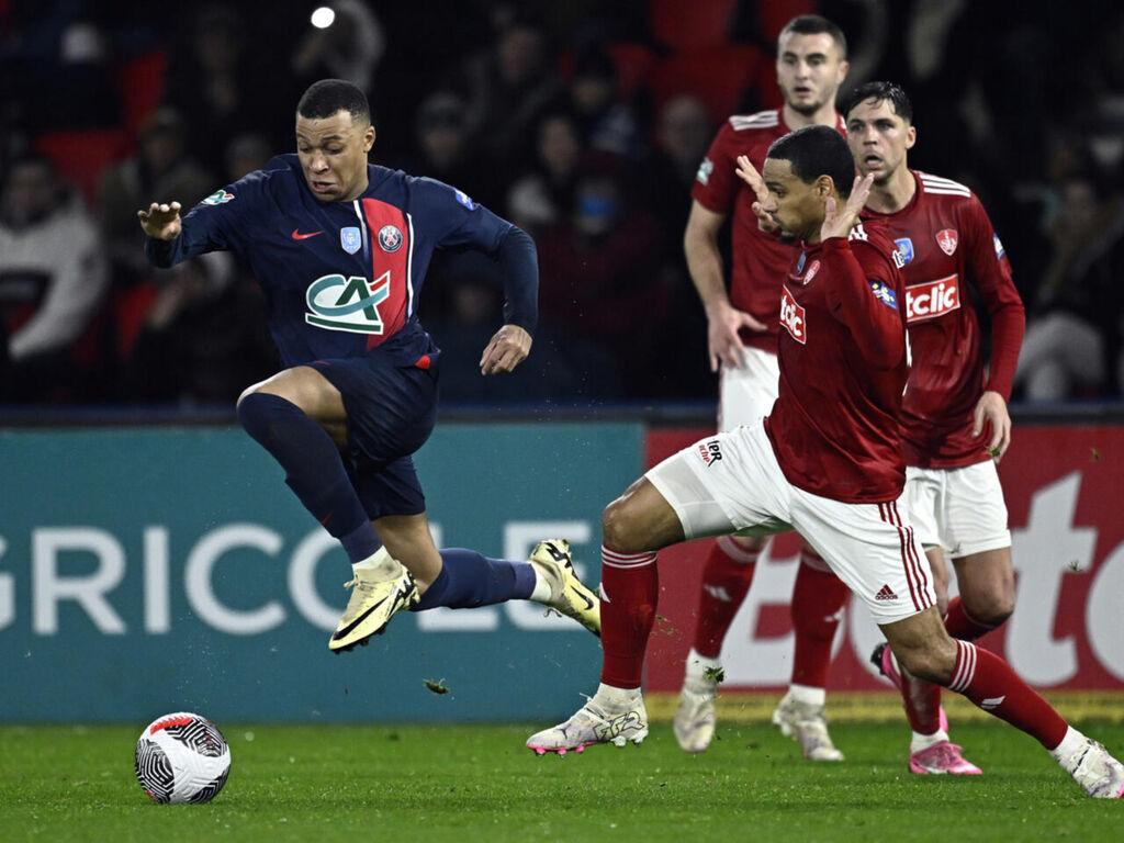 | Kylian Mbappe (gauche) avec le Paris SG contre Brest en huitièmes de finale de la Coupe de France le 7 février au Parc des Princes à Paris. |