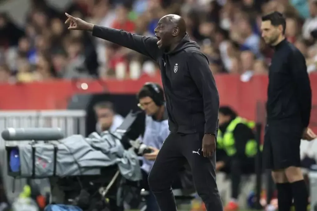 | L'entraîneur de Reims, Samba Diawara, lors du match de L1 à Nice, le 2 mai 2025. |