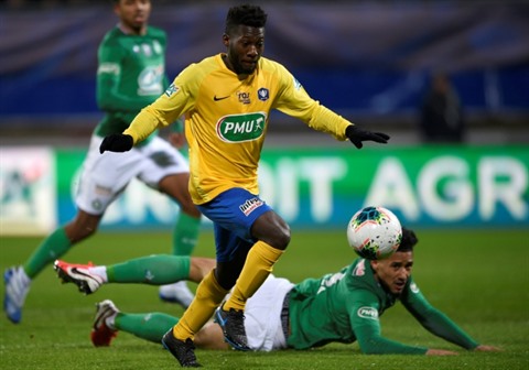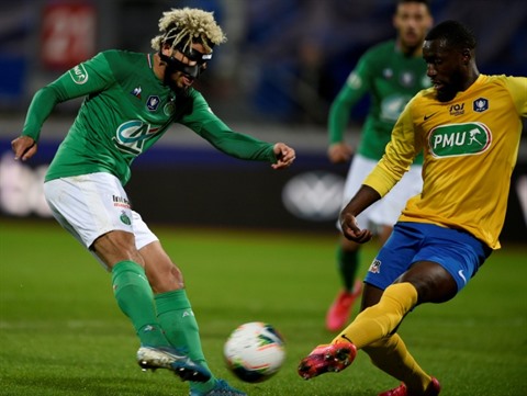 | L'attaquant d'Epinal Mickaël Biron (centre) devant le défenseur de Saint-Étienne (au sol) William Saliba, en quart de finale de la Coupe de France. |