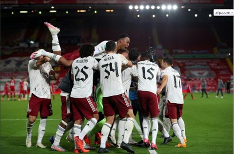 | Les joueurs d'Arsenal heureux après leur qualification en quarts de finale de la Coupe de la Ligue en s'imposant à Liverpool aux tir au but, le 1er octobre. |