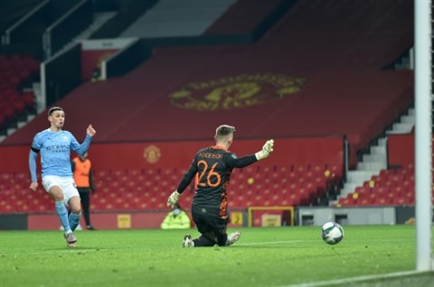 | Le milieu Phil Foden ouvre le score pour Manchester City lors de la demi-finale de la Coupe de la Ligue anglaise contre Manchester United, à Manchester, le 6 janvier. |