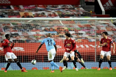 | Le milieu brésilien de Manchester City, Fernandinho (centre), buteur lors de la demi-finale de la Coupe de la Ligue anglaise face à Manchester United, à Manchester, le 6 janvier. |