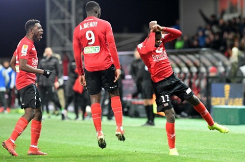 | Marcus Thuram (N°11) égalise pour Guingamp face à Monaco en demi-finale de la Coupe de la Ligue au Roudourou, le 29 janvier. |