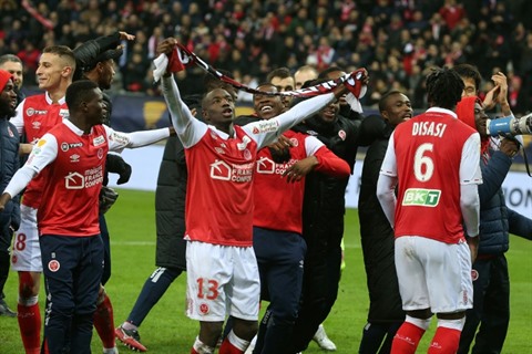 | Les joueurs du Stade de Reims fêtent leur victoire sur RC Strasbourg à l'issue des tirs au but au stade Auguste-Delaune, le 7 janvier. |