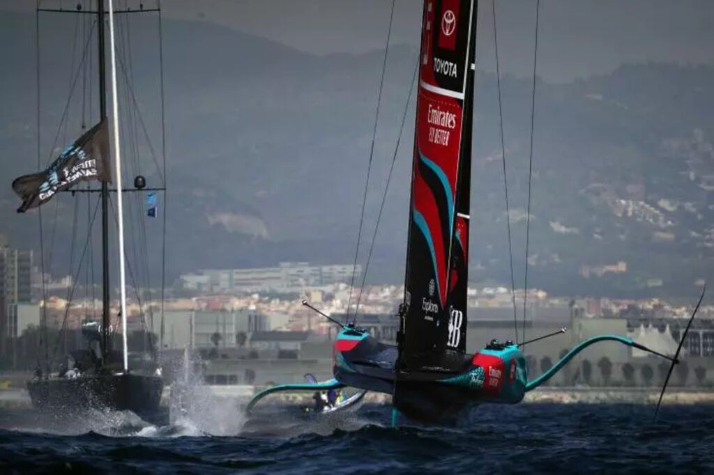 | Le defender Team Emirates New Zealand au second jour de la Coupe de l'America face aux Britanniques de Ineos Britannia au large de Barcelone en Espagne le 13 octobre. |