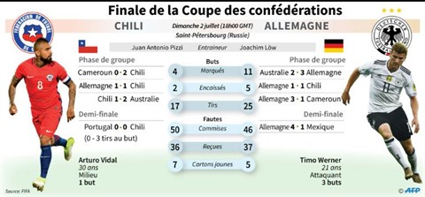 Le Chili, à l'inverse, présente la moyenne d'âge la plus élevée du plateau et même de l'histoire de la compétition (29 ans et un mois). Et s'est montré plus chiche en buts (Cameroun 2-0, Australie 1-1, et le Portugal battu aux tirs au but en demi-finale au bout d'un 0-0).