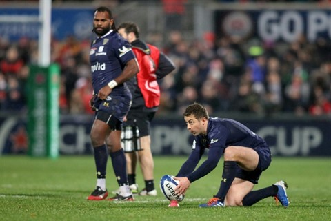 | Le demi de mêlée écossais de Clermont Greg Laidlaw s'apprête à tenter une pénalité sur le terrain de l'Ulster en Coupe d'Europe, le 22 novembre à Belfast. |