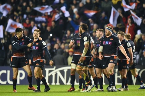 | Les joueurs d'Edimbourg célèbrent leur victoire à domicile 19-10 face à Montpellier en Coupe d'Europe le 18 janvier. |